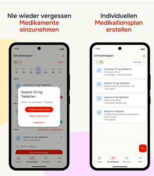 Medikations- und Einnahmeplan: Medikamente in Plan eintragen, und damit den Überblick behalten und die Therapie besser organisieren – auf Wunsch auch mit Erinnerungen, damit keine Einnahme vergessen wird.